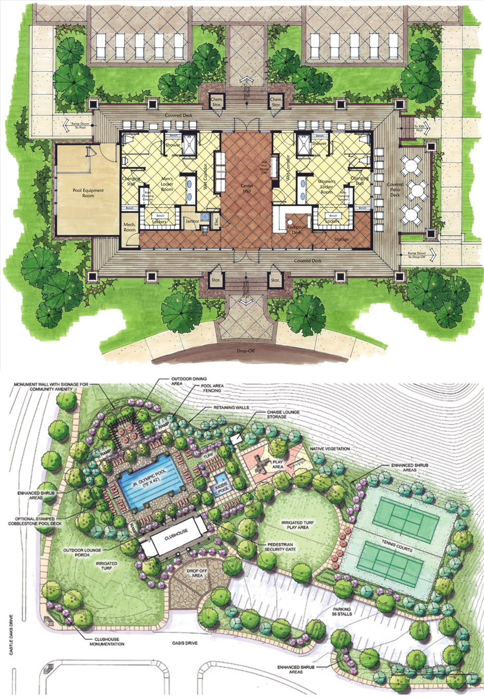 The new community clubhouse will serve as the hub of activity for the open space and recreational offerings. Amenities of the clubhouse include a reception and central gathering hall for community events, men’s and women’s changing rooms, and a covered porch area for outdoor dining and seating. The clubhouse site also offers a community pool, event lawn, kids play area, and tennis courts.