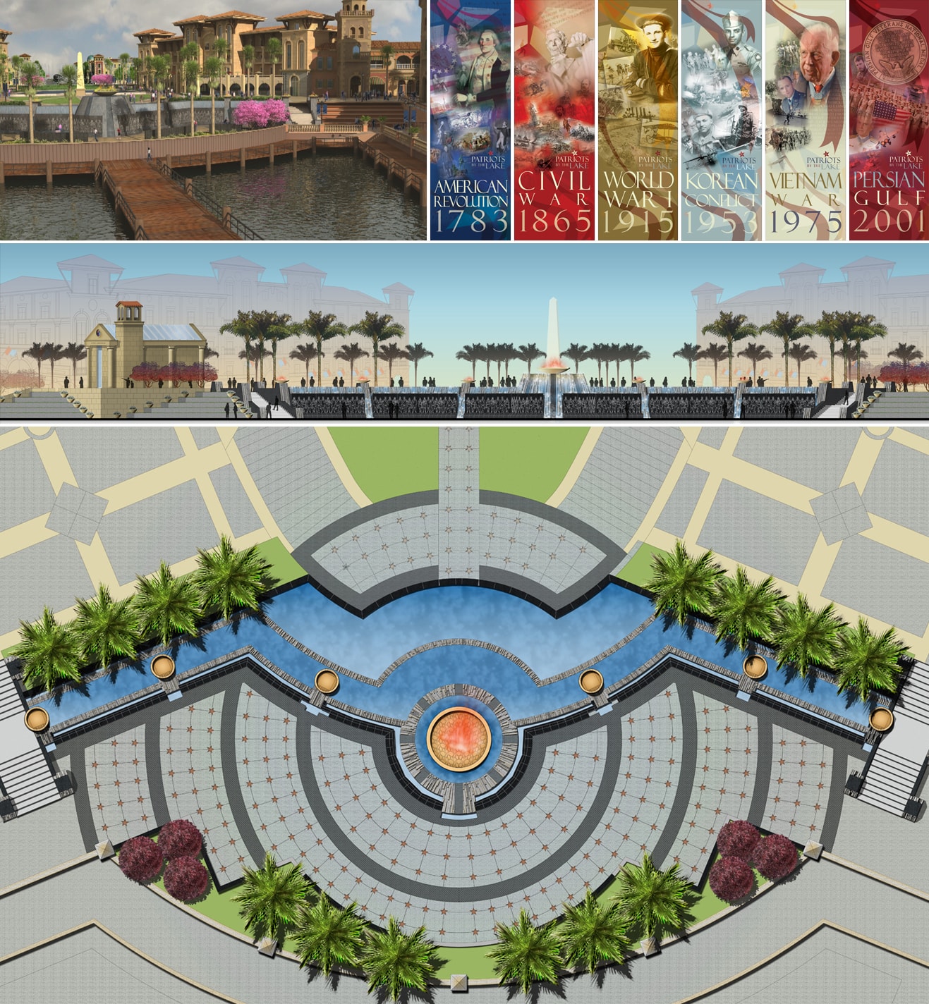 Along the shores of Lake Houston at the heart of Patriots by the Lake is the Wall of Heroes Memorial dedicated to the fallen soldiers of the Afghan and Iraqi Conflicts. The Memorial District is a continuation of the Main Street experience that begins with a grand civic plaza flanked by the Presidential Hotel and Senior Community Tower. The upper memorial plaza exhibits an expansive fountain pool with dancing water sprays, civic gathering areas and gardens, a Memorial Chapel, and a commemorative obelisk in the center of the plaza. The Wall of Heroes is located on the lower memorial plaza level displaying granite panels with life-size stone etchings of soldiers standing shoulder to shoulder who paid the ultimate price in the Afghan and Iraqi Conflicts. Inscriptions of the 5,000 fallen soldiers are displayed on the opposite walls of the memorial.