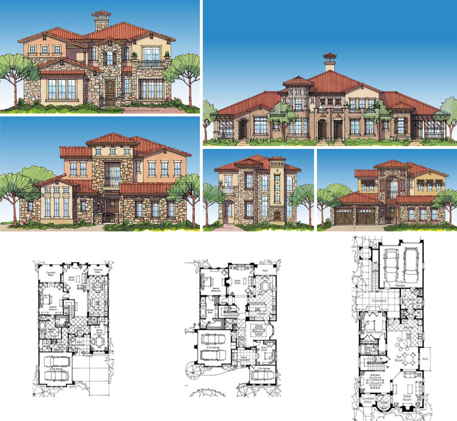 Floor plans are designed with interior courtyard spaces that allow natural light into all areas of the home. Many of the plans are fully ADA accessible with ground floor master suites and elevators accessing the second floor